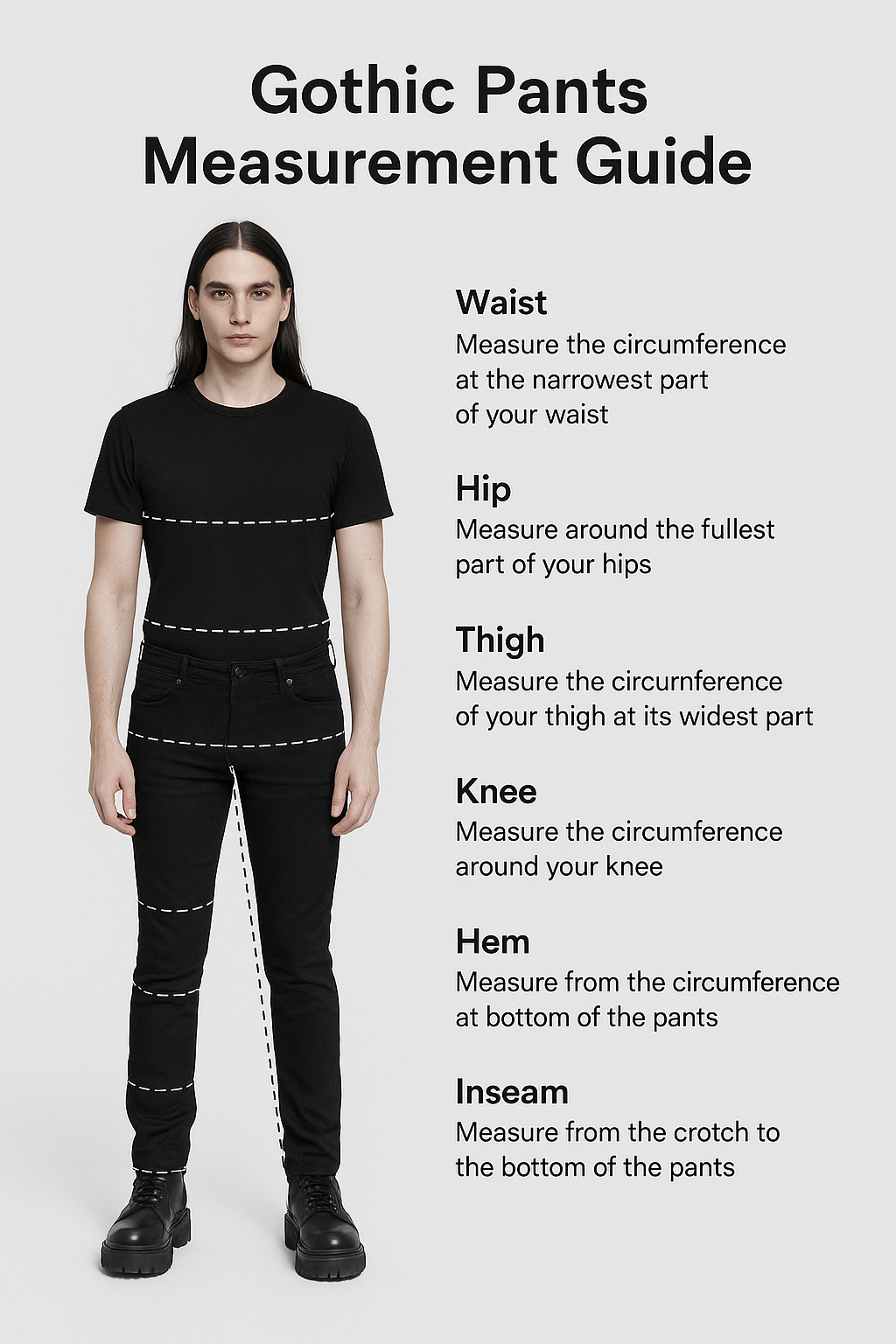This detailed men’s gothic pants measurement guide will help you capture every essential measurement to achieve a fit that balances movement, comfort, and dark allure.