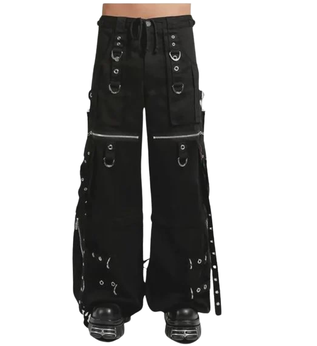 Design: Wide-leg cargo style with metal chains, zippers, and ring accents.