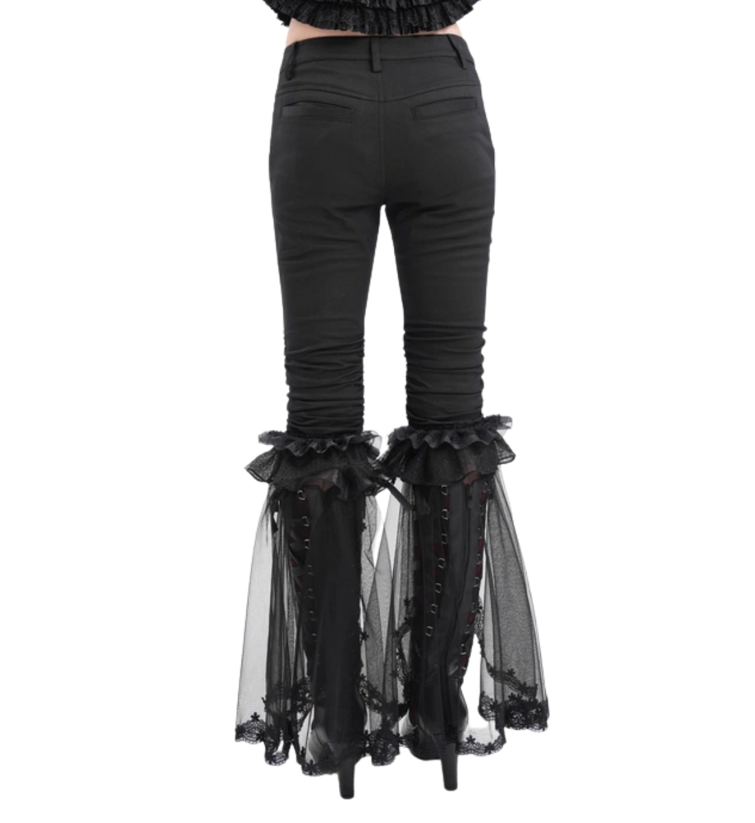 What sets these pants apart is the dramatic lace overlay. The long flares create an enchanting gothic silhouette, while the textured ruffles add depth and volume. Each element brings a touch of Victorian and Lolita-inspired design, making the pants stand out in any alternative outfit.
