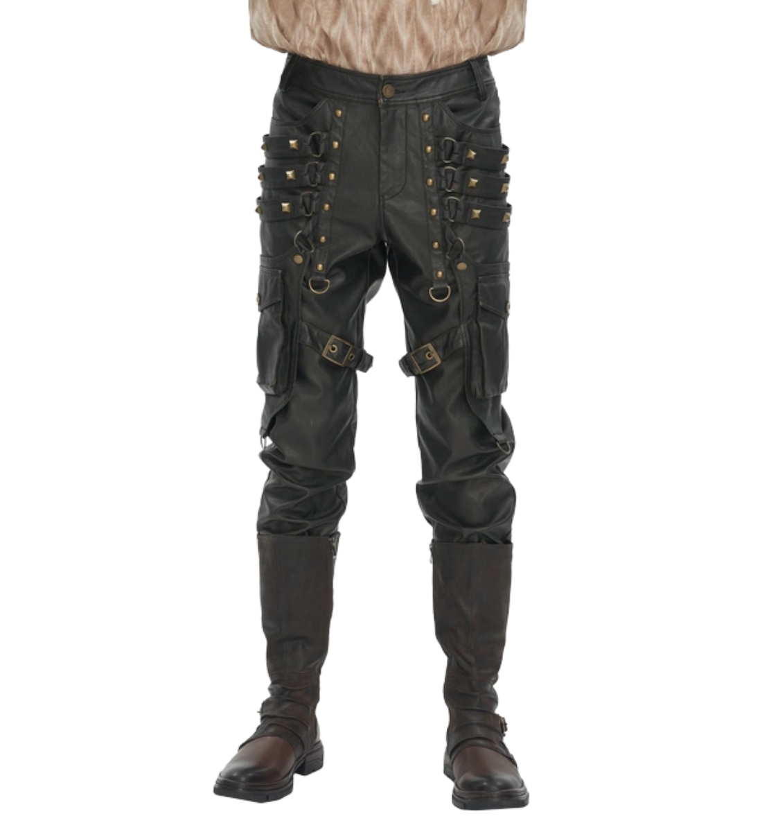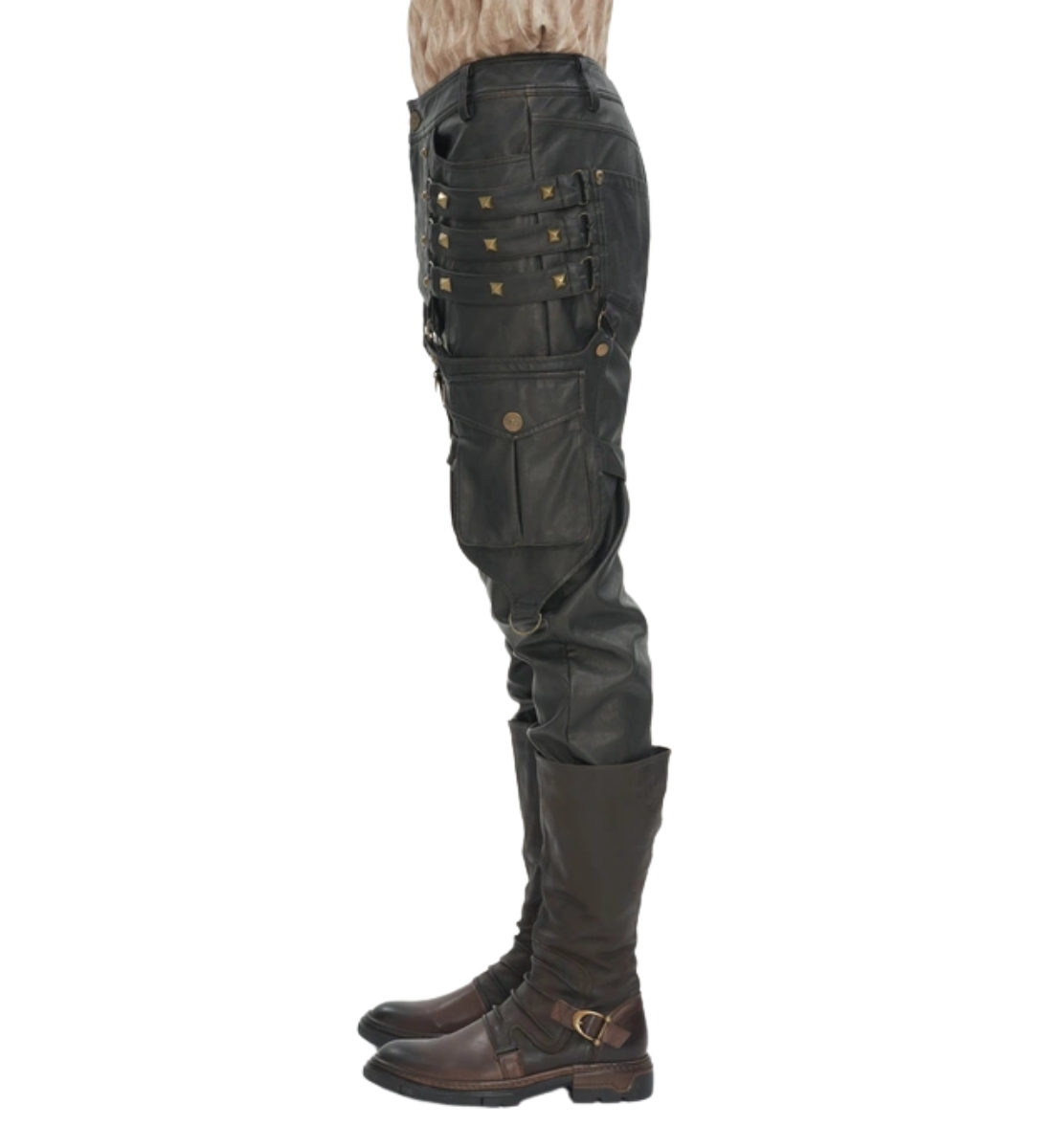 The defining feature of these pants is the rich brass finish — rings, buckles, and studs that bring a warm, vintage edge to the dark base. Each accent enhances the gothic personality of the pants while giving them a distinctive steampunk touch.