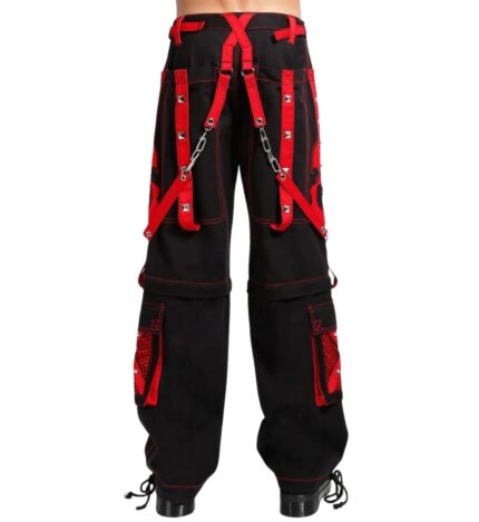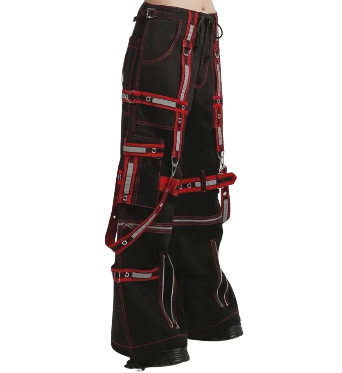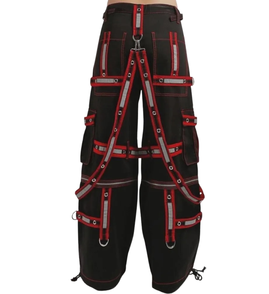 Striking red bondage cargo pants designed for bold punk and goth fashion.