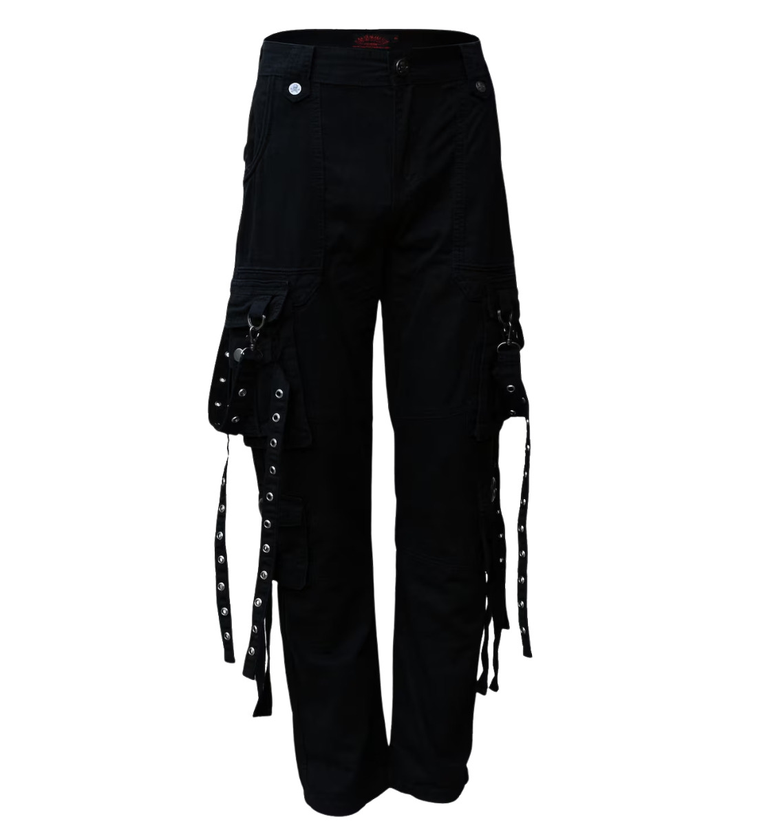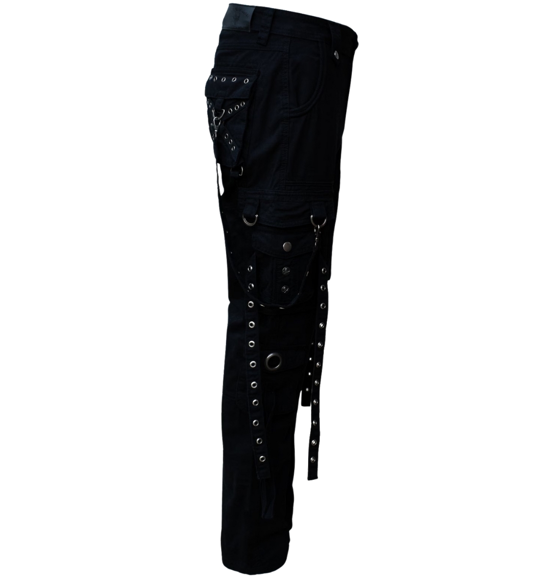 X GOTHIC DarkMatter black gothic cargo pants with chains and straps front view