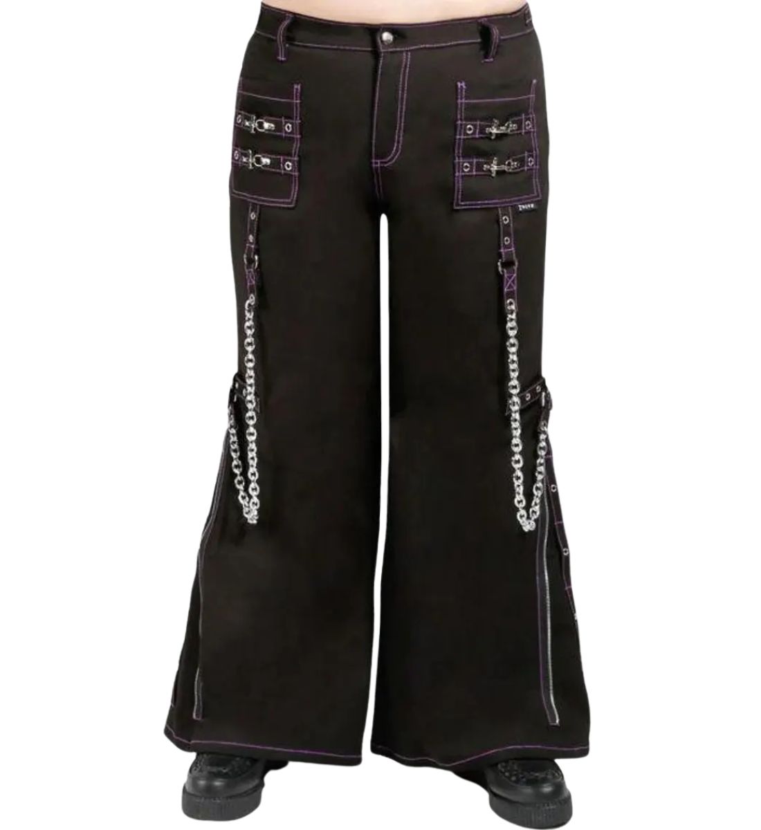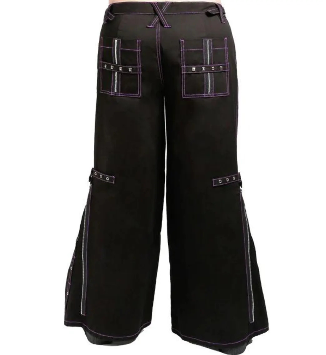 Design: Wide-leg gothic pants with silver chains, purple stitching, and zipper details.