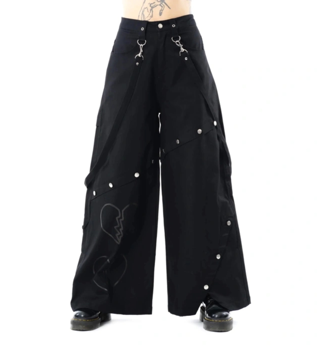• Design: Wide-leg pants with broken-heart motif, metal snaps, and removable straps.