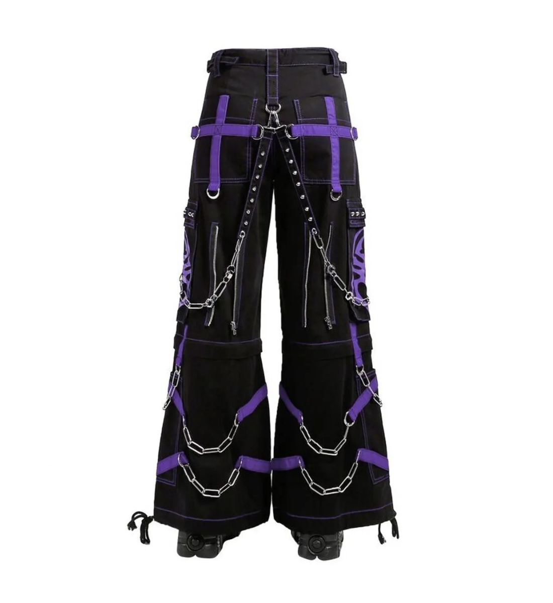 Design: Two-tone black and purple pants with removable metal chains, deep pockets, and D-rings for a bold urban edge.