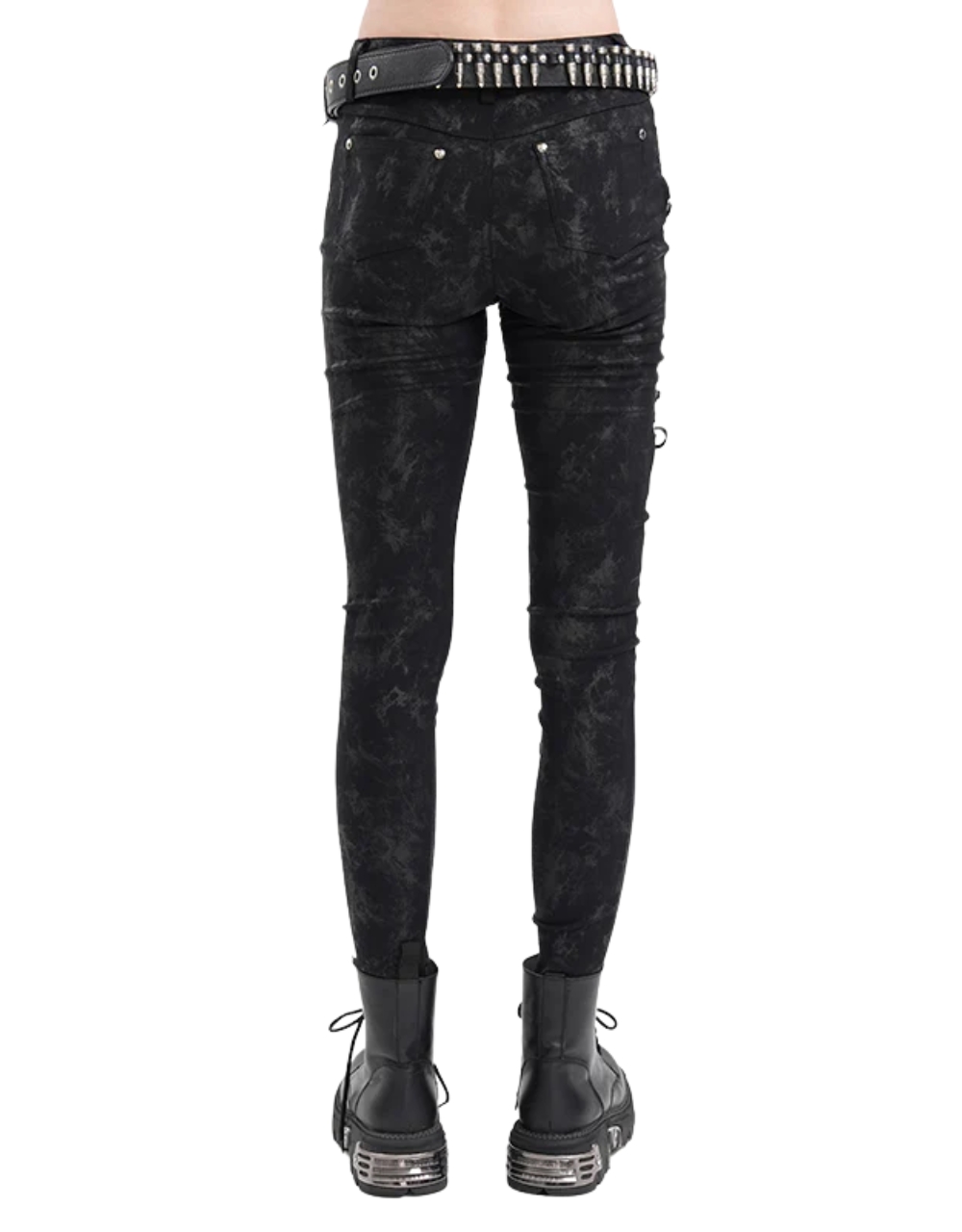 Additionally, the design integrates punk symbolism through skull studs and metallic accents. However, these elements never overpower the silhouette. Instead, they enhance it. Consequently, the pants feel refined rather than chaotic, making them suitable for both daily wear and night-focused styling.
